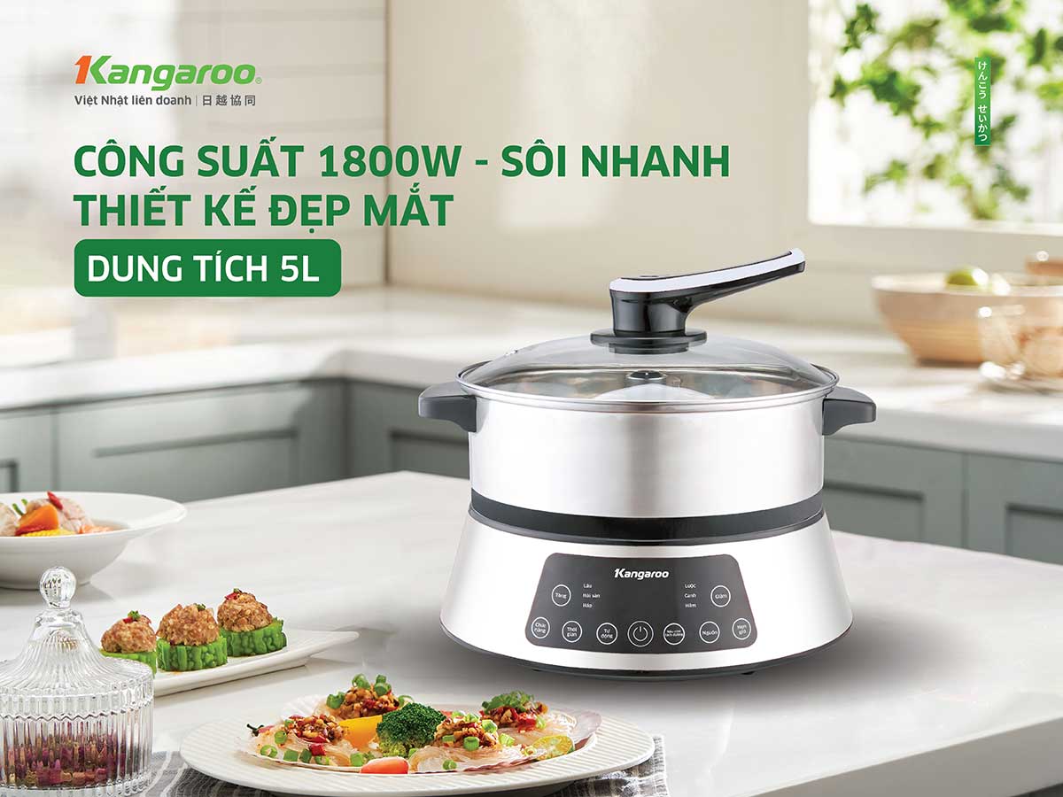 Nồi lẩu thang máy Kangaroo KGEH5D2 dung tích 5 lít, nấu được nhiều thức ăn trong 1 lần, công suất cao 1800W, thức ăn chín nhanh hơn